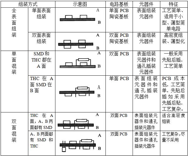 二、按組裝方式,可分為全表組裝、單面混裝、雙面混裝三種方式(見表2-1)。