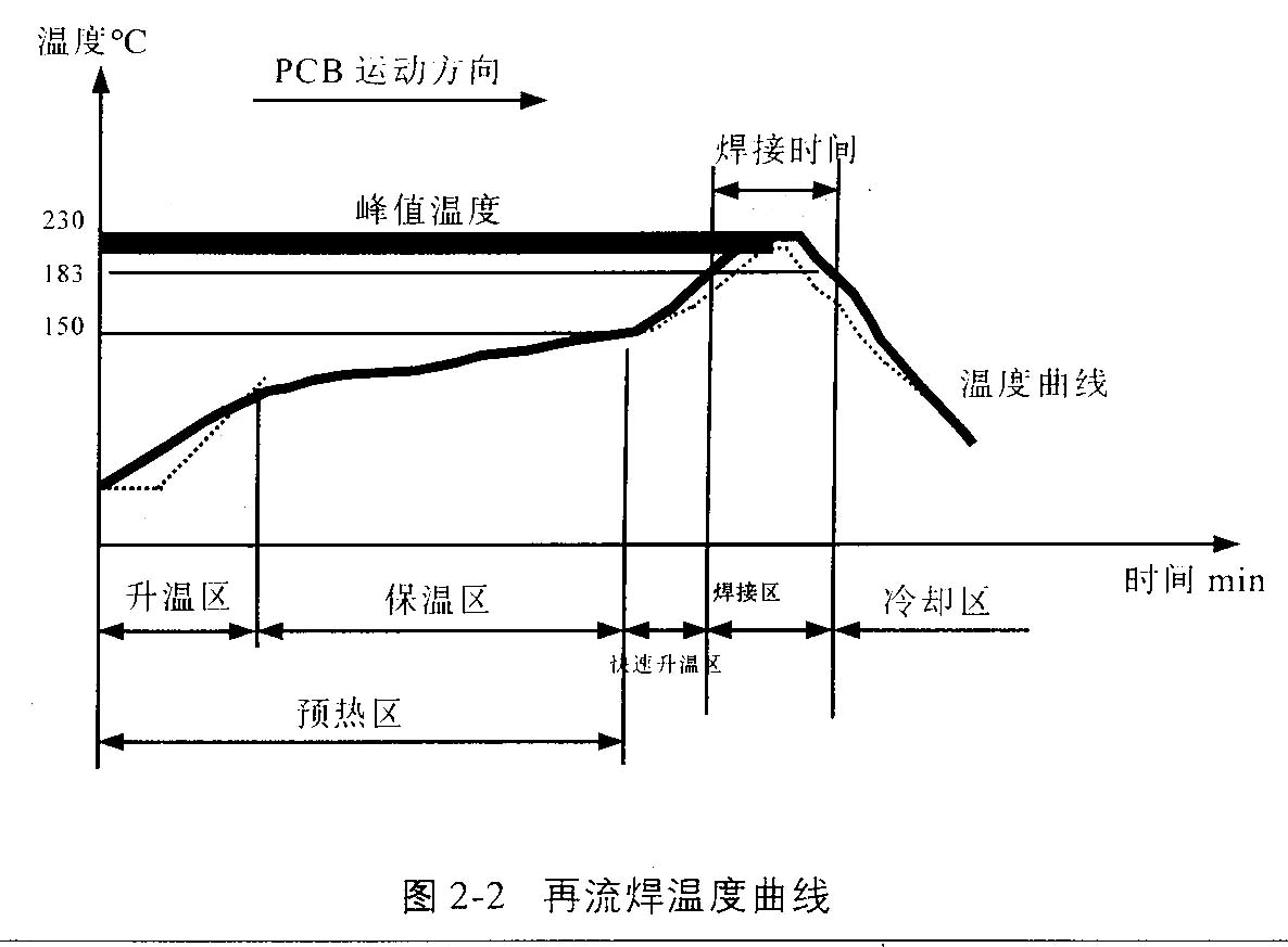 從溫度曲線(見圖2-2)分析再流焊的原理:當PCB進入升溫區(qū)(干燥區(qū))時,焊膏中的溶劑、氣體蒸發(fā)掉,同時,焊膏中的助焊劑潤濕焊盤、元器件端頭和引腳,焊膏軟化、塌落、覆蓋了焊盤、元器件端頭和引腳與氧氣隔離→PCB進入保溫區(qū)時,PCB和元器件得到充分的預熱,以防PCB突然進入焊接高溫區(qū)而損壞PCB和元器件→當PCB進入焊接區(qū)時,溫度迅速上升使焊膏達到熔化狀態(tài),液態(tài)焊錫對PCB的焊盤、元器件端頭和引腳潤濕、擴散、漫流或回流混合形成焊錫接點→PCB進入冷卻區(qū),使焊點凝固。此時完成了再流焊。