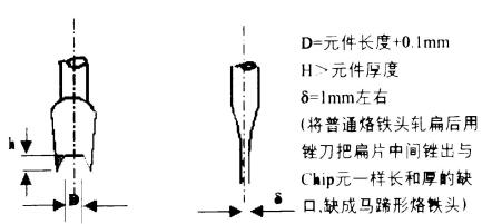 (2)用與器件尺寸相匹配雙片扁鏟式馬蹄形烙鐵頭(可自制或采購,見圖12-3)同時(shí)加熱器件兩端所有引腳焊點(diǎn)。