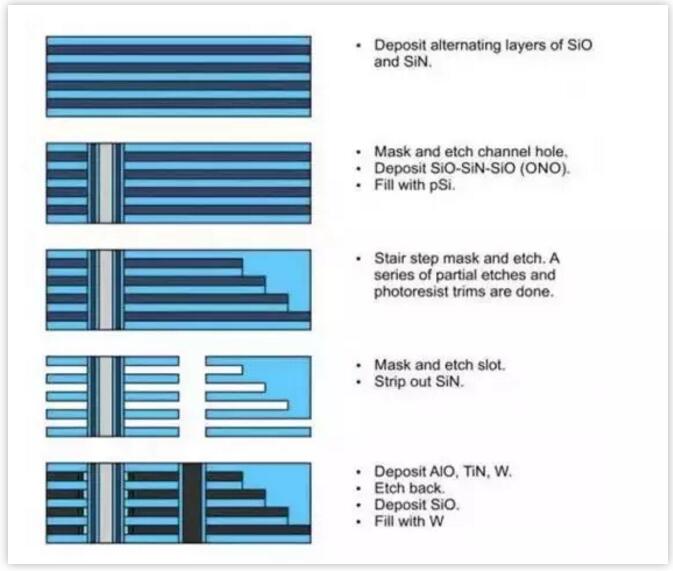 三星則開發(fā)了 Terabit Cell Array Transistor (TCAT)工藝。TCAT 是一種后柵極方法( gate-last approach),其沉積的是交替的氧化物和氮化物層。然后形成一個(gè)穿過這些層的通道并填充 ONO 和 pSi。然后與 BiCS 工藝類似形成階梯。最后,蝕刻一個(gè)穿過這些層的槽并去除其中的氮化物,然后沉積氧化鋁(AlO)、氮化鈦(TiN)和鎢(W)又對(duì)其進(jìn)行回蝕(etch back),最后用塢填充這個(gè)槽。如下圖所示: