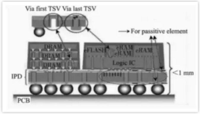 在這種3D集成技術(shù)中,至少有一顆裸芯片與另一顆裸芯片疊放在一起,下方的那顆裸芯片是采用TSV技術(shù),通過TSV讓上方的裸芯片與下方裸芯片、SiP基板通訊。如下圖所示: