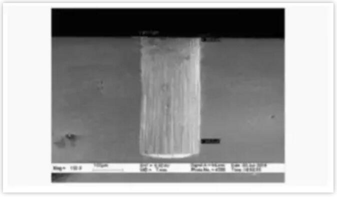 圓片上通孔制造是TSV技術(shù)的核心,目前,鉆蝕TSV技術(shù)主要有兩種,一種是干法刻蝕或稱博世刻蝕,另一種是激光刻蝕。博世工藝為MEMS工藝而開發(fā),快速地在去除硅的SF6等離子刻蝕和實(shí)現(xiàn)側(cè)壁鈍化的C4F8等離子沉積步驟之間循環(huán)切換。下圖為南京電子器件所(NEDI)利用博世工藝制作的TSV硅通孔。