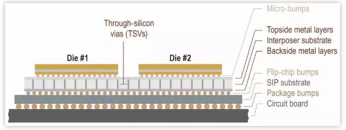 在SiP基板與裸芯片之間放置一個(gè)中介層(interposer)硅基板,中介層具備硅通孔(TSV),通過TSV連結(jié)硅基板上方與下方表面的金屬層。有人將這種技術(shù)稱為2.5D,因?yàn)樽鳛橹薪閷拥墓杌迨菬o(wú)源被動(dòng)元件,TSV硅通孔并沒有打在芯片本身上。如下圖所示:
