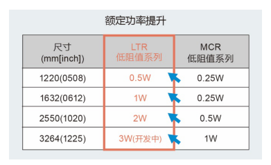 通過改善電阻體材料,不僅實現了2550(寬2.5×長5.0×高0.55mm)的小巧尺寸,與以往產品MCR50低阻值系列(0.5W)相比,還實現了4倍的額定功率(達2W)。因此可將以往產品替換為小尺寸產品。