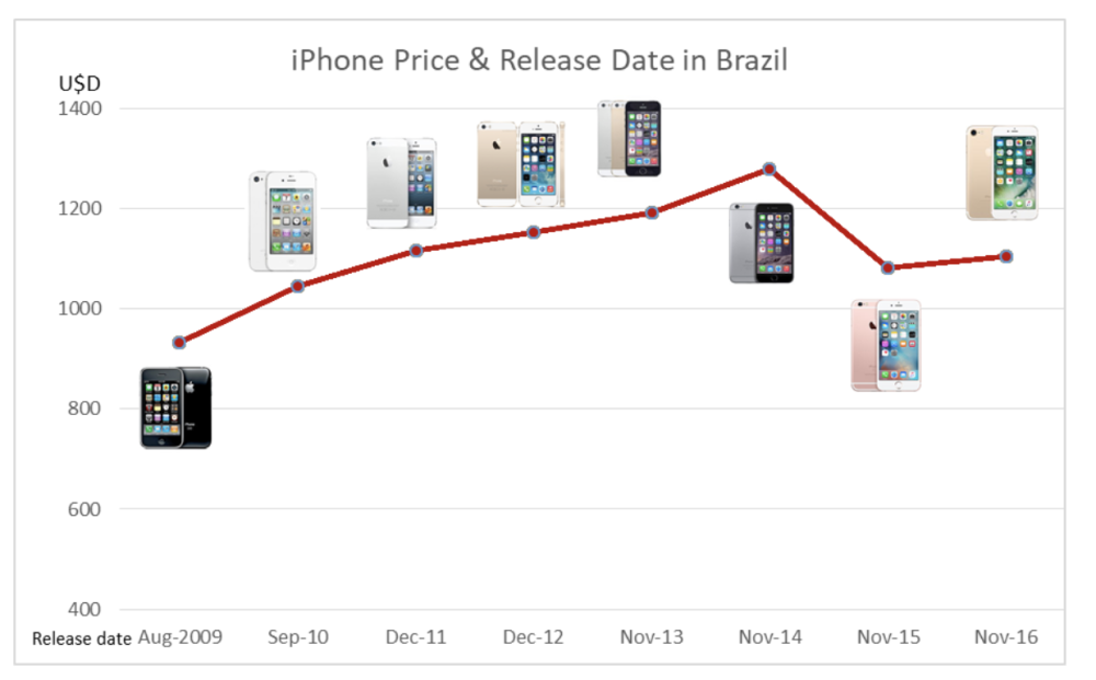 但是,富士康的出現(xiàn)并沒讓蘋果產(chǎn)品的價格下降。iPhone 6 發(fā)售時,在巴西的售價比美國售價高了 97%。甚至,連按時發(fā)售都做不到。巴西消費者見到 iPhone 4S 時,已經(jīng)比全球發(fā)售時間推遲了至少兩個月。
