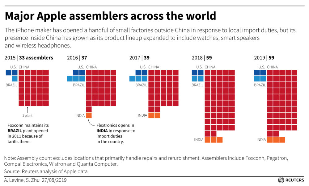 但是在這里產(chǎn)出的蘋果數(shù)量相比全球?qū)μO果的需求而言,只是杯水車薪。路透社 2019 年 8 月經(jīng)過調(diào)查后發(fā)布的報告顯示,蘋果在印度和巴西兩國生產(chǎn)的產(chǎn)品只是用來滿足當(dāng)?shù)匦枨?,而在中國增加的蘋果代工廠遠(yuǎn)超過中國以外。